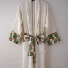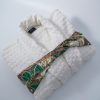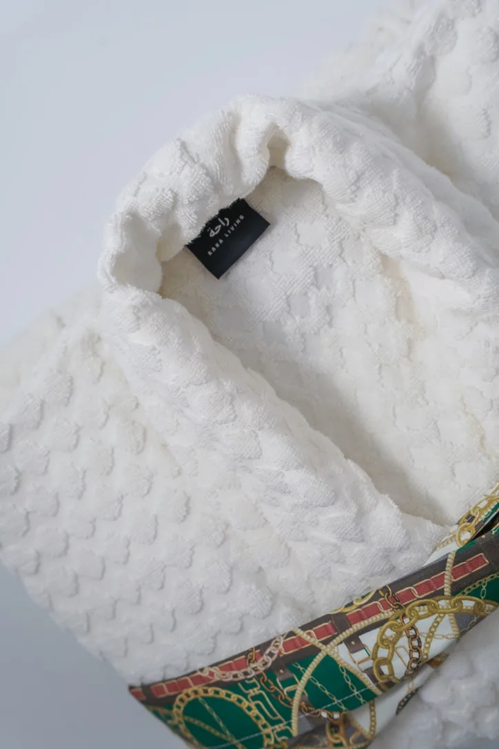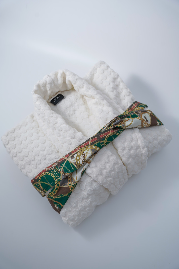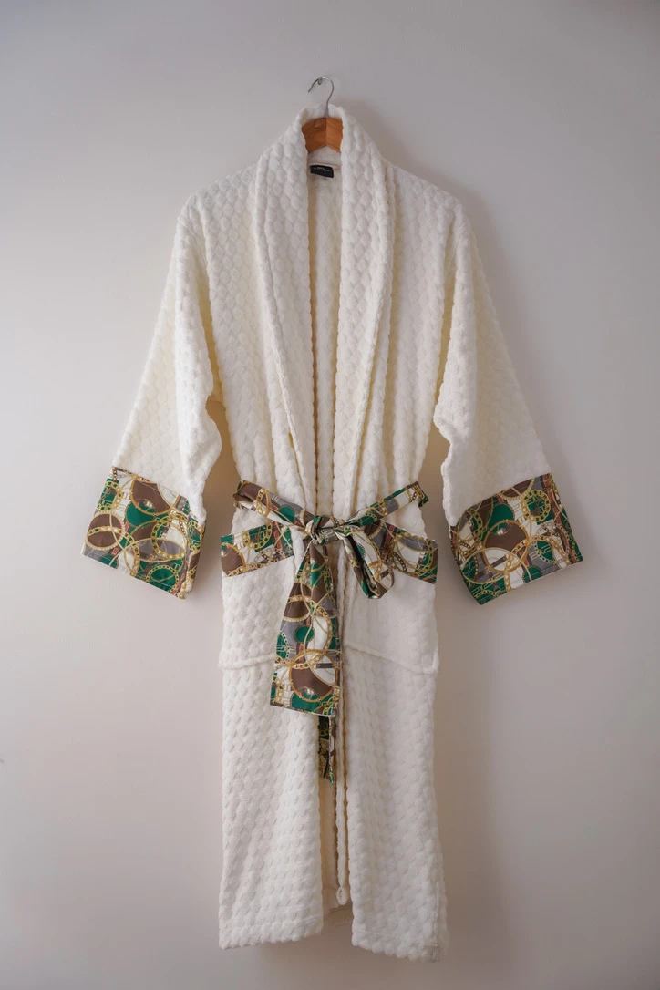 Relax in luxury with the Santorini Bathrobe, made from a premium blend of organic bamboo cotton. The self-embossed textured base adds a touch of sophistication, while the velour lapel offers a smooth, plush finish. The thick satin printed belt and sleeves create a stylish contrast, making this robe a perfect combination of comfort and modern elegance.
